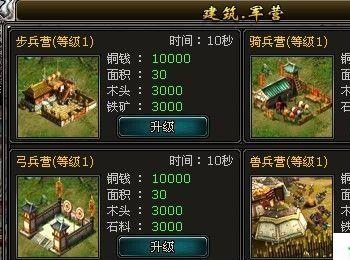 军营 军营包括:步兵营、骑兵营、弓兵营、兽兵营和战车营。用来提升各兵种阶级,兵种阶级越高,士兵的基础能力越高。