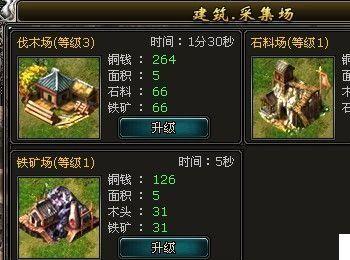 采集场 采集场包括:伐木场、石料场和铁矿场。用来提高各种资源的采集速度。