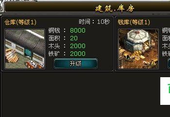 库房 库房包括:仓库和钱库。用来提高资源和铜钱的存放上限。