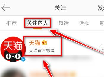2.第二步,来到下图所示的关注页面后,点击页面顶部的关注的人选项,接着点击想要加入对方粉丝群的对象,小编选择了天猫。