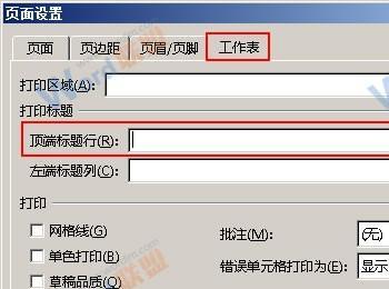 3、此时会弹出一个“页面设置”对话框,我们切换到“工作表”选项卡,然后将光标定位到“打印标题”区域中的“顶端标题行”文本框内。