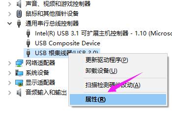 4. 第四步先右键单击【USB根集线器】,接着在弹出的菜单栏中根据下图箭头所指,点击【属性】选项。
