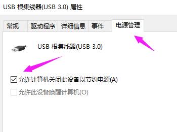 5. 第五步打开【属性】窗口后,根据下图箭头所指,先点击【电源管理】选项,接着取消勾选【允许计算机关闭这个设备以节约电源】。