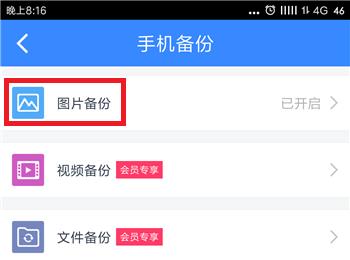 四、如图所示,备份中有“图片备份”“视频备份”“文件备份”等各种分类备份。以“图片备份”为例: