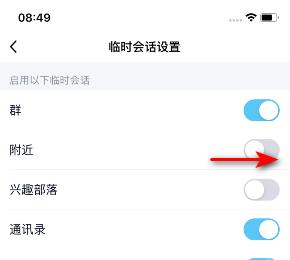 6.第六步,在下图所示的临时会话设置页面中,打开附近右边的开关,使其变成蓝色。