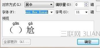 ②在拼音指南的“基准文字”中将“尴”字删除,输入“()”,为了显得更加逼真,建议括号中再输入两个空格,然后将字体改为”Times New Roman”。