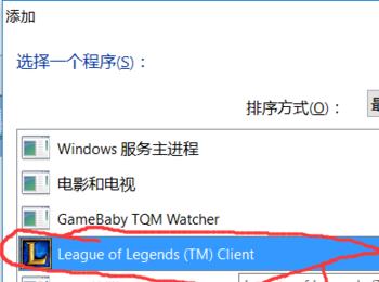 4、找到“League of Legends(TM)Client”(记住一定是这个),然后点击“添加选定的程序”;