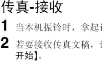 文件接收 传真机进行手动接收时, 其操作步骤如下(如图所示): (1) 当电话铃响后提起话筒和对方应答 如听到“哔”声后, 按“开始”键 (2) 谈话完毕后按“开始”键 (3) 把话筒放回原处 (4) 机器自动接收 (5) 传真完成。