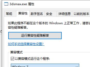 作者在安装目录下找到3dsmax.exe文件,右键修改兼容性为Windows 7,确定。
