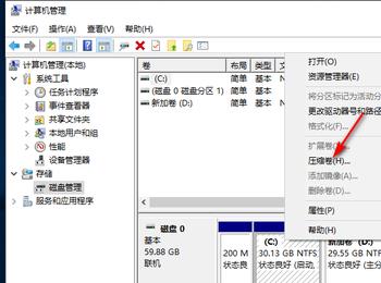 2. 然后在右侧选择想要的分区,右键,在打开的菜单中,选择”压缩卷“选项。