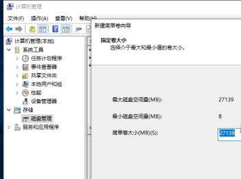 5. 在弹出的新建简单卷向导窗口中,点击下一步,输入新分区的大小,继续点击下一步。