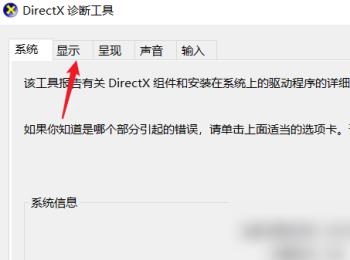 4. 第四步打开【DirectX诊断工具】窗口后,根据下图箭头所指,点击顶部【显示】选项。