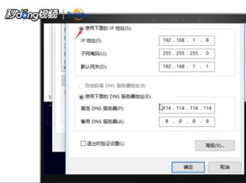 在弹出的对话框中点击“使用下面的IP地址”,并把相关参数改为一下参数,最后点击“确认”即可
