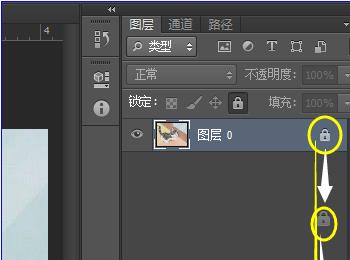1. 首先第一步根据下图箭头所指,将图层后的【锁】图标向下拖动至底部【垃圾桶】。