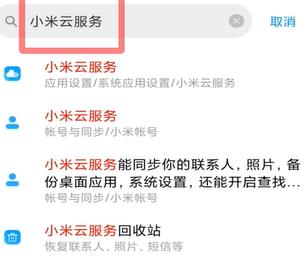 2 在打开的设置页面,上方的搜索框中,输入“小米云服务”,然后点击下方的“小米云服务”。