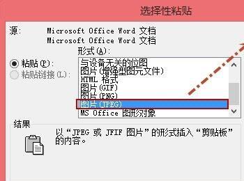 5打开“选择性粘贴”对话框,在“粘贴”右侧框中选择“图片(JPEG)”,然后单击“确定”。