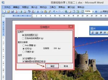 下面解决文档瘦身方法,压缩图片。打开要瘦身的文档,单击图片,选中图片后会显示图片工具条,然后单击“压缩图片”图标,打开“压缩图片”对话框,设置压缩图片的选项,完成后单击“确定”即可。