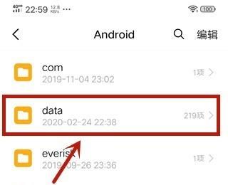 4.第四步,我们可以看到如下图所示的Android文件夹页面,点击箭头所指的data文件夹。