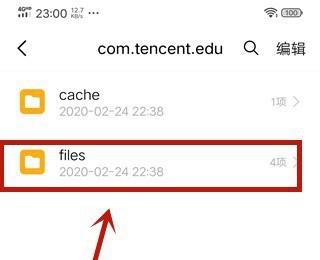 6.第六步,在下图所示的com.tencent.edu文件夹页面中,点击箭头所指的files文件夹。