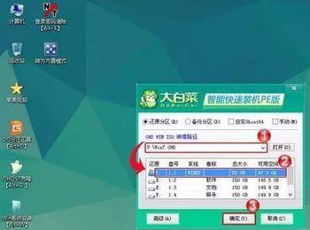 6、桌面上一个程序叫“大白菜一键装机”,打开这个程序,选择“还原分区”,然后按下图步聚操作。这里特别需要强调的是,在选择目标分区的时候一定不要选错了,安装过程会清除分区上的所有数据。如果选错的话,就会导致该分区上的数据丢失。