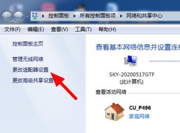 3. 在打开的网络和共享中心页面,点击左上方的更改适配器设置选项;