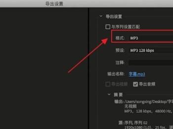 4.第四步,我们可以看到如下图所示的导出设置页面,更改视频导出的格式为mp3格式。
