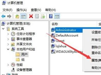 5. 第五步,在右侧的窗口中,找到Administrator的用户名,右键点击该用户,然后点击弹出菜单中的属性选项。