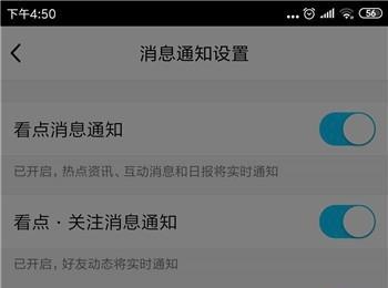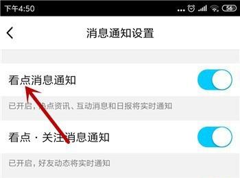 5.第五步,进入消息通知设置页面,在下方找到看点消息通知功能,再点击右侧的开关,将其关闭。
