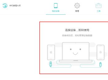 1. 如图,以手机管理大师工具为例,没有的请大家自行下载安装,打开电脑上的工具,然后使用USB数据线连接电脑和手机;