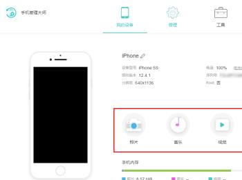 3. 连接好之后,如图,在页面上就可以看到“照片、音乐、视频、通讯录、信息”等分类,点击即可对手机对应的文件进行管理了;
