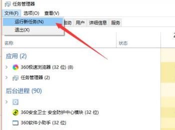 5. 第五步先搜索并打开【任务管理器】窗口,接着根据下图箭头所指,依次点击【文件-运行新任务】选项。