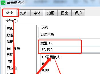 6.第六步,在下图所示的设置单元格格式页面中,点击页面顶部的数字选项,接着点击页面左侧的自定义选项,然后点击类型下面的输入框,并输入“经理@”,接着点击右下角的确定选项。