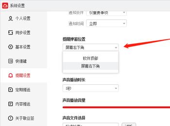 3.在右侧打开的页面,找到“提醒弹窗位置”栏,点击下方的下拉符号,在打开的菜单中,就可以根据自己的实际需要,选择“软件顶部”或“屏幕右下角”即可,选择之后,就自动进行保存了,关闭设置窗口即可。