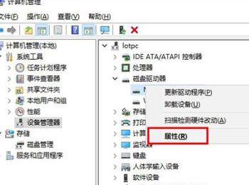 4. 在打开的计算机管理页面,点击左侧的“设备管理器”,在右侧打开的页面,找到磁盘驱动器,展开,然后在固态硬盘上,右键选择属性选项。
