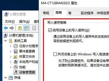 5. 我在弹出的窗口中,上方切换到策略选项下,如图,下方显示写入缓存策略,下方的打开和关闭的选项的意义在于:当SSD执行写入指令的时候,写入的数据是写入到缓存还是写入到NAND闪存颗粒,才向系统报告,这里我们需要将“启用设备上的写入缓存”的选项勾选上。
