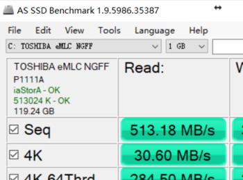 2. 我们此时在主板中开启了AHCI,固态硬盘也已经4K对齐,线材也更换成SATA3.0了,主板插在SATA3.0接口,使用AS SSD Benchmark软件测速的结果,显示如下。