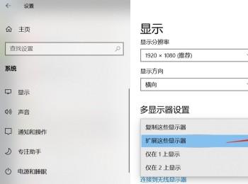 4. 在打开的‘显示’设置页面,点击‘多显示设置’下的下拉符号,在打开的菜单中,选择‘扩展这些显示器’选项