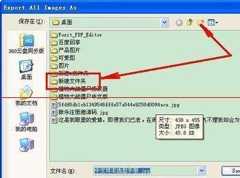 6、弹出对话框,显示导出图片需要存放的位置。这里建议大家新建一个文件夹,把图片保存进新建文件夹中,以免默认导出的图片扑满整个桌面。