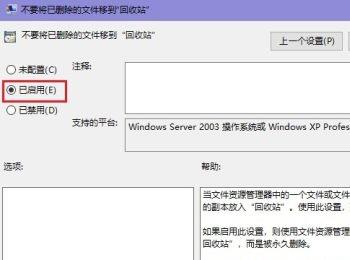 4. 双击该选项,在弹出的【不要将删除的文件移到回收站】窗口中,点选上左上方的【已启用】然后点击【确定】按钮,最后重启电脑即可。