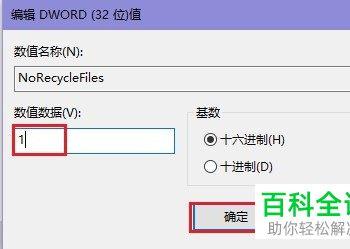 4. 在新建的【NoRecycleFiles】值上双击,在弹出的窗口中,设置数值数据为【1】,最后点击底部的确定按钮,重启电脑即可完成设置。