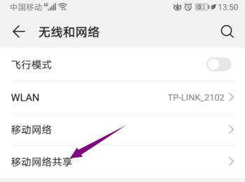 3. 进入无线和网络页面后,选择移动网络共享选项,打开。