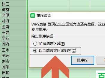 3. 第三步,在弹出的排序警告窗口中,点击以当前选定区域排序选项,然后点击排序按钮,将进入排序窗口。