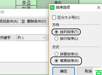 5.第五步,在弹出的排序选项窗口中,将方向设置为按列排序,然后将方式设置为笔画排序。