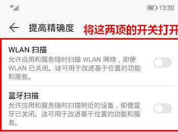 6. 第六步,跳转至提高精确的页面后,点击下方wlan扫描与蓝牙扫描右侧的开关,将其打开即可提高精确度。