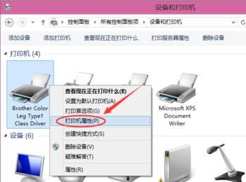 3. 第三步进入【设备和打印机】页面后,先右键单击目标打印机,接着在弹出的菜单栏中根据下图箭头所指,点击【打印机属性】选项。