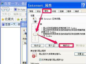 进入Internet 选项的“隐私”选项卡,在网站级别上设置为“中”,然后点击“高级”按钮。