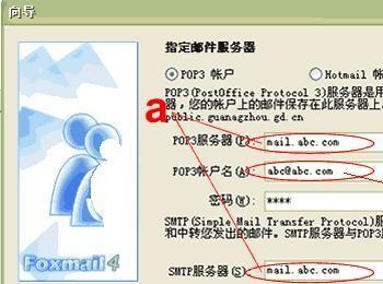 4、点击下一步弹出以下窗口,在a处填入"mail.abc.com",在b处填入您的整个邮箱地(如abc@abc.com,注意要带上后缀@abc.com);
