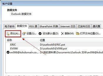 进入账户设置以后,点击【数据文件】选项。再点击添加,添加你原邮件文件存储的位置。