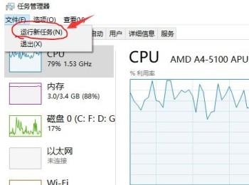 6.第五步,结束explorer进程之后,返回任务管理器主页,然后点击左上方的文件选项,再点击下拉菜单中的运行新任务选项,,点击界面上端的“文件”菜单里的“运行新任务”选项。