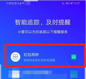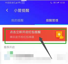 6. 第六步进入【小管提醒】页面后,根据下图箭头所指,点击【开启红包提醒】选项。